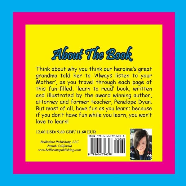 You should always listen to those who love you, because those who love you always have your best interests at heart. Find out what our heroine's great grandmother had to tell her about someone in our heroine's life, her dear, sweet mother, and why our heroine had to think about what it meant when her great grandmother told her to listen to her mother. Think about why it is important to listen to those who love you (especially as to your own dear, sweet mother) as you practice reading skills and build your reading word vocabulary through word recognition, word repetition and rhyme, all of which you will find on the pages this fun-filled 'learn to read' book written and illustrated by award winning author, attorney and former teacher, Penelope Dyan. But most of all, be sure to have fun as you learn; because learning must be (and should always be) fun, or a kid like you just won't love to learn! And when you are all finished traveling through this book, you can go to Bellissimavideo's YouTube channel; and you can watch the free, fun music video that goes with this book and and you can have even more learning fun!!