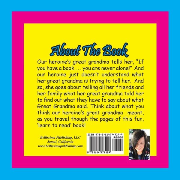 As our heroine is heading out the door to play, our heroine's great grandma tells our heroine, "If you have a book . . . you are never alone!" And our heroine is left wondering what Great Grandma meant! And so, our heroine (as usual) decides to ask everyone she knows what they think about what Great Grandma said. And (of course) she begins with the elephant! Think about what you would tell our heroine as you practice reading skills, and as you build your reading word vocabulary through word recognition, word repetition and rhyme, all of which you will find on the pages this fun, 'learn to read' book written and illustrated by award winning author, attorney and former teacher, Penelope Dyan. But most of all, have fun as you learn; because learning must be (and should always be) fun, or a kid like you just won't love to learn! And when you are all finished traveling through this book, you can go to Bellissimavideo's YouTube channel; and you can watch the free, fun music video that goes with this book! And then you can have even more learning fun!