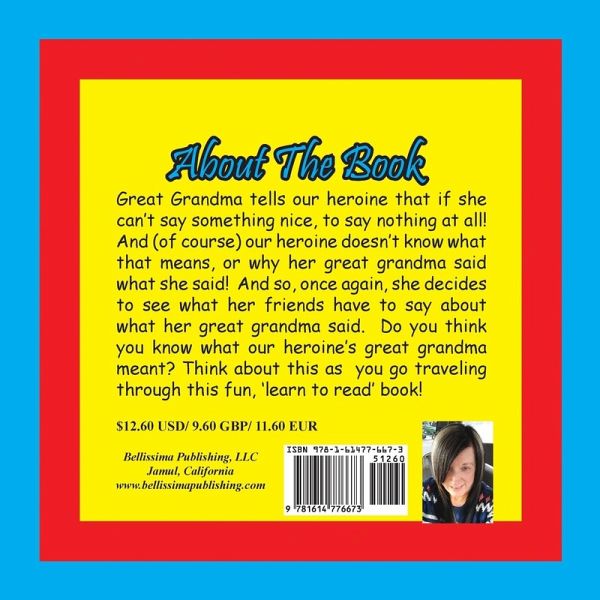 Our heroine's great grandma tells her to say something nice or say nothing at all. Our heroine doesn't understand why her great grandma told her this, or what her great grandma meant by what she said. And so, our heroine goes about telling everyone she knows (beginning with the elephant) what her great grandma told her, to find out if they have any thoughts on the subject. And in the end, she figures out what her great grandma meant all by herself herself! As you turn each page of this book, think about what you think about what our heroine's great grandma meant, and why she said what she said; and practice your reading skills and build your reading word vocabulary through word recognition, and word repetition and rhyme, all of which you will find on the pages of this fun, 'learn to read' book written and illustrated by the award winning author, attorney and former teacher, Penelope Dyan. Most of all, have fun as you learn; because learning must be (and should be) fun, or a kid like you just won't love to learn! And when you are all finished traveling through this book, you can go to Bellissimavideo's YouTube channel; and you can watch the free, fun music video that goes with this book!
