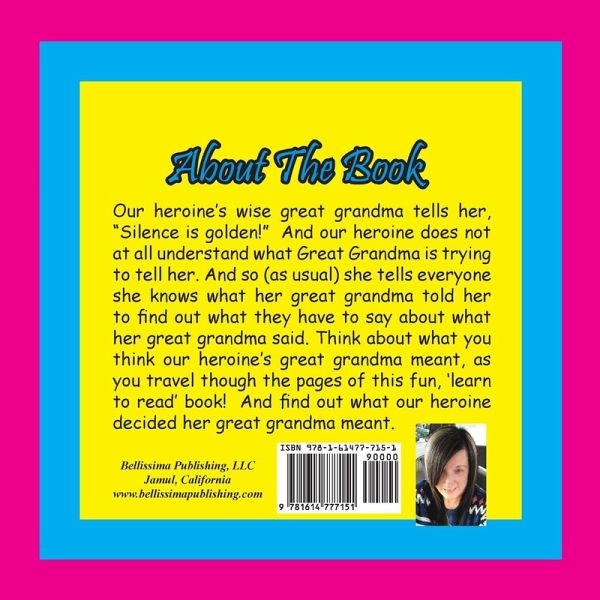 Our heroine's great Grandma tells our heroine that silence is golden! And our heroine is left wondering what her great grandma meant! Had she been too noisy? She just did not understand, especially since Great Grandma seemed fond of talking in riddles! And so, our heroine asks everyone she knows what they think about what Great Grandma said. And she begins with the elephant! Think about what you would tell our heroine as you practice reading skills, and as you build your reading word vocabulary through word recognition, word repetition and rhyme, all of which you will find on the pages this fun, 'learn to read' book written and illustrated by award winning author, attorney and former teacher, Penelope Dyan. But most of all, have fun as you learn; because learning must be (and should always be) fun, or a kid like you just won't love to learn! And when you are all finished traveling through this book, you can go to Bellissimavideo's YouTube channel; and you can watch the free, fun music video that goes with this book! And then you can have even more learning fun!