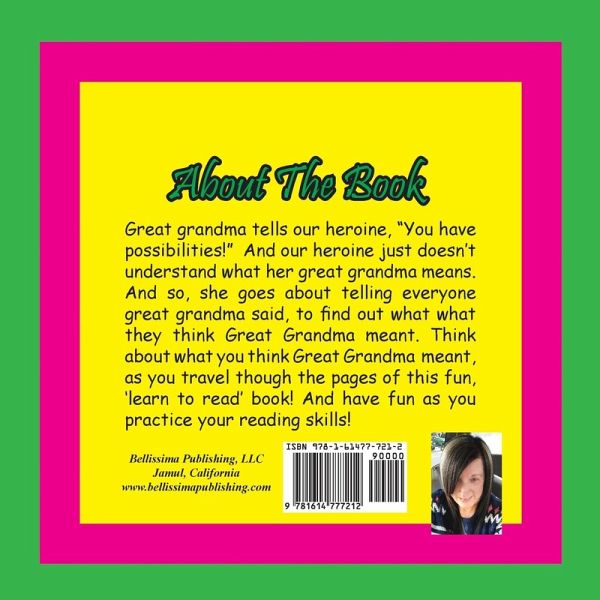 Great Grandma tells our heroine, "You have possibilities!" And our heroine is once again left wondering what her Great Grandma means! (It seems Great Grandma is ever so fond of talking in riddle.) And so, after that, our heroine decides to ask everyone she knows what they think about what Great Grandma said. And (as she usually does) she begins with the elephant! Think about what you would tell our heroine as you practice reading skills, and as you build your reading word vocabulary through word recognition, word repetition and rhyme, all of which you will find on the pages this fun, 'learn to read' book written and illustrated by award winning author, attorney and former teacher, Penelope Dyan. But most of all, have fun as you learn; because learning must be (and should always be) fun, or a kid like you just won't love to learn! And when you are all finished traveling through this book, you can go to Bellissimavideo's YouTube channel; and you can watch the free, fun music video that goes with this book! And then you can have even more learning fun!