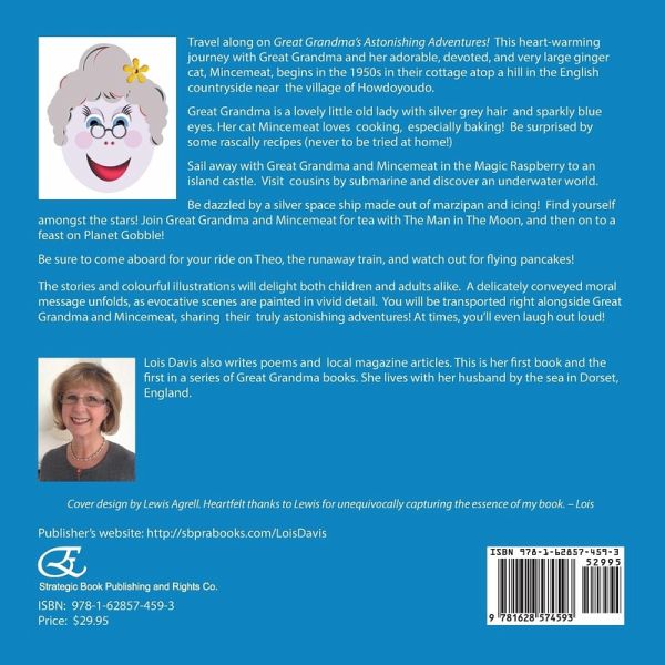 Travel along on Great Grandma's Astonishing Adventures! This heart-warming journey with Great Grandma and her adorable, devoted, and very large ginger cat, Mincemeat, begins in the 1950s in their cottage atop a hill in the English countryside near the village of Howdoyoudo. Great Grandma is a lovely little old lady with silver grey hair and sparkly blue eyes. Her cat Mincemeat loves cooking, especially baking! Be surprised by some rascally recipes (never to be tried at home!) Sail away with Great Grandma and Mincemeat in the Magic Raspberry to an island castle. Visit cousins by submarine and discover an underwater world. Be dazzled by a silver space ship made out of marzipan and icing! Find yourself amongst the stars! Join Great Grandma and Mincemeat for tea with The Man in The Moon, and then on to a feast on Planet Gobble! Be sure to come aboard for your ride on Theo, the runaway train, and watch out for flying pancakes! The stories and colourful illustrations will delight both children and adults alike. A delicately conveyed moral message unfolds, as evocative scenes are painted in vivid detail. You will be transported right alongside Great Grandma and Mincemeat, sharing their truly astonishing adventures! At times, you'll even laugh out loud! Lois Davis also writes poems and local magazine articles. This is her first book and the first in a series of Great Grandma books. She lives with her husband by the sea in Dorset, England. Publisher's website: http://sbprabooks.com/LoisDavis