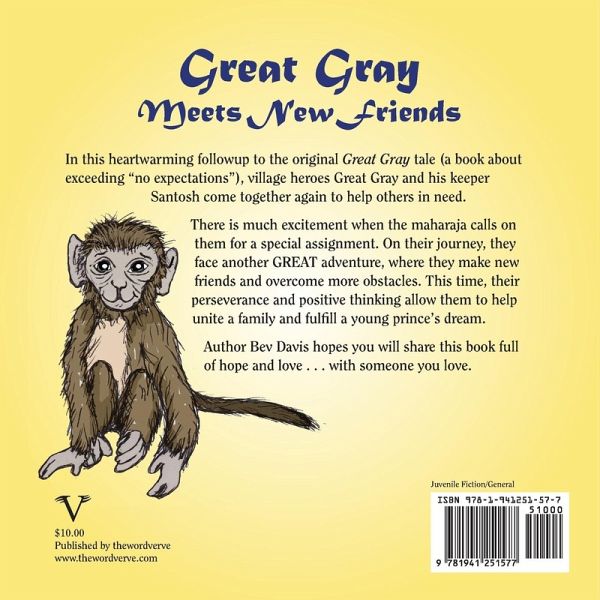 In this heartwarming followup to the original Great Gray tale (a book about exceeding "no expectations"), village heroes Great Gray and his keeper Santosh come together again to help others in need. There is much excitement when the maharaja calls on them for a special assignment. On their journey, they face another GREAT adventure, where they make new friends and overcome more obstacles. This time, their perseverance and positive thinking allow them to help unite a family and fulfill a young prince's dream. Author Bev Davis hopes you will share this book full of hope and love...with someone you love.