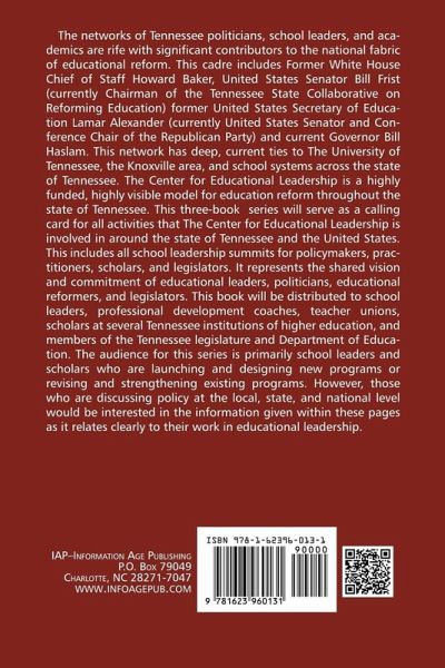 The networks of Tennessee politicians, school leaders, and academics are rife with significant contributors to the national fabric of educational reform. This cadre includes Former White House Chief of Staff Howard Baker, United States Senator Bill Frist (currently Chairman of the Tennessee State Collaborative on Reforming Education) former United States Secretary of Education Lamar Alexander (currently United States Senator and Conference Chair of the Republican Party) and current Governor Bill Haslam. This network has deep, current ties to The University of Tennessee, the Knoxville area, and school systems across the state of Tennessee. The Center for Educational Leadership is a highly funded, highly visible model for education reform throughout the state of Tennessee. This 3 book series will serve as a calling card for all activities that The Center for Educational Leadership is involved in around the state of Tennessee and the United States. This includes all school leadership summits for policy makers, practitioners, scholars, and legislators. It represents the shared vision and commitment of educational leaders, politicians, educational reformers, and legislators. This book will be distributed to school leaders, professional development coaches, teacher unions, scholars at several Tennessee institutions of higher education, and members of the Tennessee legislature and Department of Education. The audience for this series is primarily school leaders and scholars who are launching and designing new programs or revising and strengthening existing programs. However, those who are discussing policy at the local, state, and national level would be interested in the information given within these pages as it relates clearly to their work in educational leadership.
