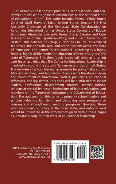 The networks of Tennessee politicians, school leaders, and academics are rife with significant contributors to the national fabric of educational reform. This cadre includes Former White House Chief of Staff Howard Baker, United States Senator Bill Frist (currently Chairman of the Tennessee State Collaborative on Reforming Education) former United States Secretary of Education Lamar Alexander (currently United States Senator and Conference Chair of the Republican Party) and current Governor Bill Haslam. This network has deep, current ties to The University of Tennessee, the Knoxville area, and school systems across the state of Tennessee. The Center for Educational Leadership is a highly funded, highly visible model for education reform throughout the state of Tennessee. This 3 book series will serve as a calling card for all activities that The Center for Educational Leadership is involved in around the state of Tennessee and the United States. This includes all school leadership summits for policy makers, practitioners, scholars, and legislators. It represents the shared vision and commitment of educational leaders, politicians, educational reformers, and legislators. This book will be distributed to school leaders, professional development coaches, teacher unions, scholars at several Tennessee institutions of higher education, and members of the Tennessee legislature and Department of Education. The audience for this series is primarily school leaders and scholars who are launching and designing new programs or revising and strengthening existing programs. However, those who are discussing policy at the local, state, and national level would be interested in the information given within these pages as it relates clearly to their work in educational leadership.