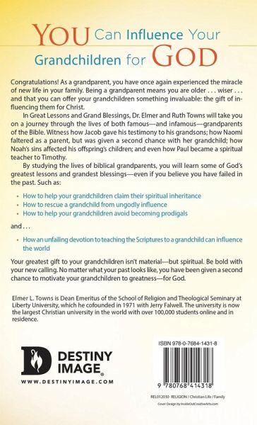 You Can Influence Your Grandchildren for God Congradulations! As a grandparent, you have once again experienced the miracle of new life in your family. Being a grandparent means you are older...wiser...and that you can offer your grandchildren something invaluable: the gift of influencing then for Christ. In great Lessons and Grand Blessings, Dr Elmer Towns will take you on a journey through the lives of both famous-and infamous-grandparents of the Bible. Witness how Jacob gave his testimony to his grandparents of the Bible. Witness how Jacob gave his testomony to his grandsons; how Naomi faltered as a parent, but was given a second chance with her grandchild; how Noah's sins affected his offspring's children; and even how Paul became a spiritual teacher to Timothy. By studying the lives of biblical grandparents, yu will learn some of God's greatest lessons and grandest blessings-even if you believe you have failed in the past. Such as: How to help your grandchildren claim their spiritual inheritance How to rescue a grandchild from ungodly influence How to help your grandchildren avoid becoming prodigals and... How an unfailing devotion to teaching the Scriptures to a grandchild can influence the world Your greatest gift to yur grandchildren isn't material-but spiritual. Be bold with your new calling. No matter what your past looks like, you have been given a second chance to motivate your grandchildren to greatness-for God.