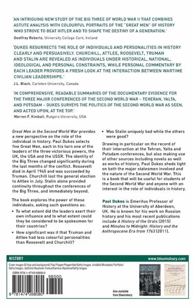 Great Men in the Second World War provides a new perspective on the role of the individual in history. Paul Dukes selects five Great Men, each in his turn one of the leaders of the three victorious powers, the UK, the USA and the USSR. The identity of the Big Three changed significantly during the last months of the conflict. Roosevelt died in April 1945 and was succeeded by Truman. Churchill lost the general election to Attlee in July. Stalin alone provided continuity throughout the conferences of the Big Three, and immediately beyond. The book explores the power of these individuals, asking such questions as: -To what extent did the leaders exert their own influence and to what extent could they be considered to be spokesmen for their countries? -How significant was it that Truman and Attlee had less colourful personalities than Roosevelt and Churchill? -Was Stalin uniquely bad while the others were good? Drawing in particular on the record of their interaction at the Tehran, Yalta and Potsdam Conferences, but also making use of other sources including novels as well as works of history, Paul Dukes sheds light on both the major statesmen involved and the nature of the Second World War. This is a book that will be useful for students of the Second World War and anyone with an interest in the role of individuals in history.