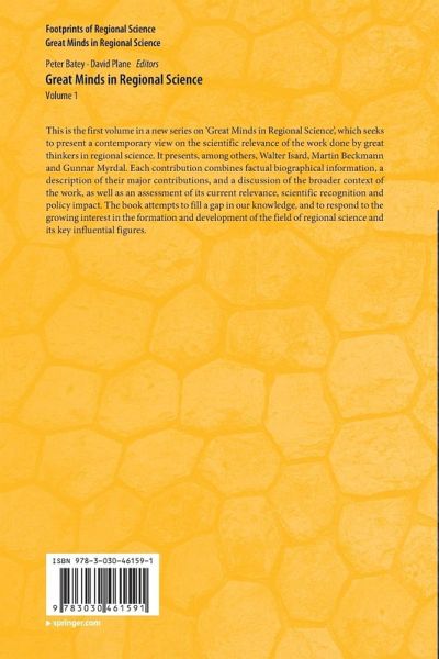 This is the first volume in a new series on 'Great Minds in Regional Science,' which seeks to present a contemporary view on the scientific relevance of the work done by great thinkers in regional science. It presents, among others, Walter Isard, Martin Beckmann and Gunnar Myrdal. Each contribution combines factual biographical information, a description of their major contributions, and a discussion of the broader context of the work, as well as an assessment of its current relevance, scientific recognition and policy impact. The book attempts to fill a gap in our knowledge, and to respond to the growing interest in the formation and development of the field of regional science and its key influential figures.