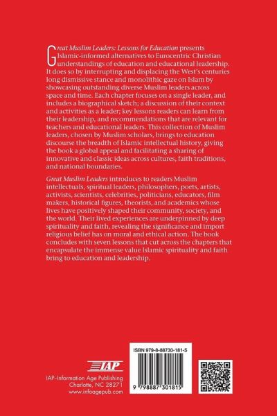 Great Muslim Leaders presents Islamic-informed alternatives to Eurocentric Christian understandings of education and educational leadership. It does so by interrupting and displacing the West's centuries long dismissive stance and monolithic gaze on Islam by showcasing outstanding diverse Muslim leaders across space and time. Each chapter focuses on a single leader, and includes a biographical sketch; a discussion of their context and activities as a leader; key lessons readers can learn from their leadership, and recommendations that are relevant for teachers and educational leaders. This collection of Muslim leaders, chosen by Muslim scholars, brings to education discourse the breadth of Islamic intellectual history, giving the book a global appeal and facilitating a sharing of innovative and classic ideas across cultures, faith traditions, and national boundaries. Great Muslim Leaders introduces to readers Muslim intellectuals, spiritual leaders, philosophers, poets, artists, activists, scientists, celebrities, politicians, educators, film makers, historical figures, theorists, and academics whose lives have positively shaped their community, society, and the world. Their lived experiences are underpinned by deep spirituality and faith, revealing the significance and import religious belief has on moral and ethical action. The book concludes with seven lessons that cut across the chapters that encapsulate the immense value Islamic spirituality and faith bring to education and leadership.
