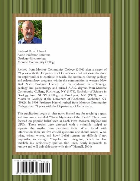 The scientific method is a process which evaluates the theories proposed by verifying the data used to make such claims as Bigfoot, Loch Ness Monsters and other popular beliefs. There are essential tools one should employ to determine truth from falsehood: Scientific Method, Skepticism, and Critical Thinking. To me Carl Sagan was the Standard Bearer against pseudoscience. In his book: The Fine Art of Baloney, Detection, one must be doubtful of information which is not verifiable. In this book are numerous popular beliefs which deserve a critical mind before one shares them with others with testing the stories with the Baloney Detection Kit. This book: Great Mysteries of the Earth will explore some of the most popular claims by pseudoscientists and the absence of science to support their facts.