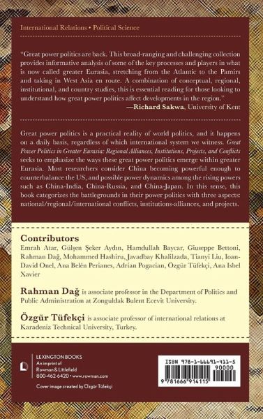 Introduction: Great Power Politics by Rahman Dag and Özgür Tüfekçi Chapter 1: Power Politics over Syrian Crisis: A New Battleground Among Global, Regional and Sub-National Powers by Rahman Dag and Özgür Tüfekçi Chapter 2: Causes and Prospects of The Georgia South-Ossetia Conflict: Applying the ARIA Framework by Javadbay Khalilzade Chapter 3: Balancing in Central Asia: Russia-China Relations at the Region's Level in Realist Perspective by Ioan-David Onel Chapter 4: Challenges and Prospects for Future of the EU Relations in Central Asia: The Special Case of Kazakhstan by Ana Belén Perianes Chapter 5: CSTO & EAEU and the Path to a New Eurasia: Return or Retreat? by Ana Isabel Xavier Chapter 6: UK's Post Brexit Strategy "Global Britain": A Quest of being Great Power by Emrah Atar and Hamdullah Baycar Chapter 7: The Geopolitical View of The European Union and China's The Belt and Road Initiative by Tianyi Liu and Giuseppe Bettoni Chapter 8: The Renewal of Dashed Turkish Hopes in Central Asia by Gülsen Sek