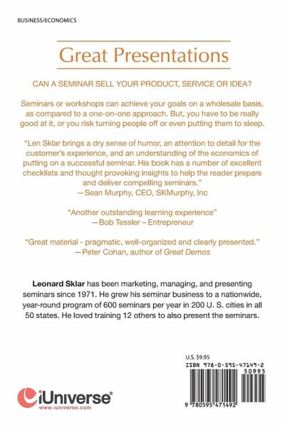 CAN A SEMINAR SELL YOUR PRODUCT, SERVICE OR IDEA? Seminars or workshops can achieve your goals on a wholesale basis, as compared to a one-on-one approach. But, you have to be really good at it, or you risk turning people off or even putting them to sleep. "Another outstanding learning experience" - Bob Tessler Entrepreneur "Great material - pragmatic, well-organized and clearly presented." - Peter Cohan, author of Great Demos "Len Sklar brings a dry sense of humor, an attention to detail for the customer's experience, and an understanding of the economics of putting on a successful seminar. His book has a number of excellent checklists and thought provoking insights to help the reader prepare and deliver compelling seminars." --Sean Murphy, CEO, SKMurphy, Inc