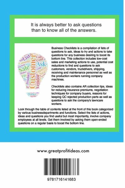 A collection of checklists containing questions to ask and ideas to try covering various business departments and functions. All of the checklists were written specifically to suggest ideas to try and actions to take that will ultimately help improve productivity, to cut costs, improve margins and increase sales, all designed to boost your bottom line.