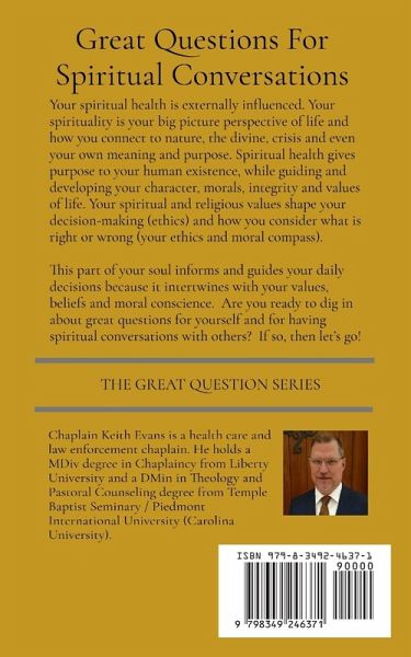 Great Questions For Spiritual Conversations Your spiritual health is externally influenced. your spirituality is your big picture perspective of life and how you connect to nature, the divine, crisis and even your own meaning and purpose. Spiritual health gives purpose to your humanity and existence, while guiding and developing your character, morals, integrity and values of life. Your spiritual and religious values shape your decision-making and how you consider what is right or wrong (your ethics and moral compass). This part of your soul informs and guides you daily decisions because it intertwines with your values, beliefs and moral conscience. Are you ready to dig in about great questions for yourself and for having spiritual conversations with others? If so, let's go!