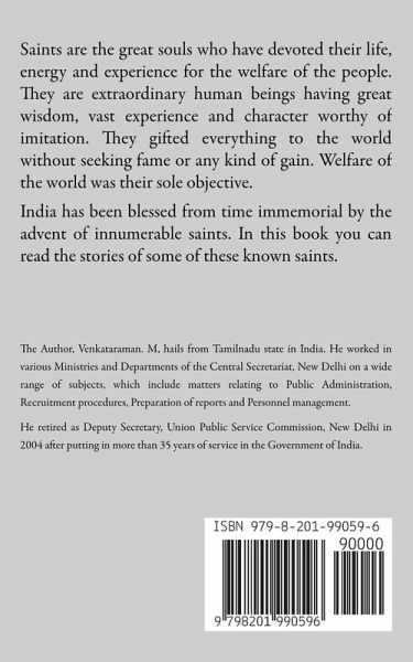 Saints are the great souls who have devoted their life, energy and experience for the welfare of the people. They are extraordinary human beings having great wisdom, vast experience and character worthy of imitation. They gifted everything to the world without seeking fame or any kind of gain. Welfare of the world was their sole objective. India has been blessed from time immemorial by the advent of innumerable saints. In this book you can read the stories of some of these known saints.