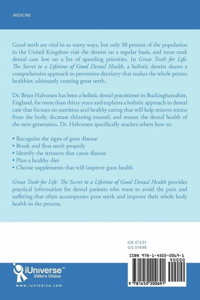 Good teeth are vital in so many ways, but only fifty percent of the population in the United Kingdom visit the dentist on a regular basis and most rank dental care low on a list of spending priorities. In Great Teeth for Life: The Secret to a Lifetime of Good Dental Health, a holistic dentist shares a comprehensive approach to preventive dentistry that makes the whole person healthier, ultimately creating great teeth. Dr. Brian Halvorsen has been a holistic dental practitioner in Buckinghamshire, England, for over thirty years and explains a holistic approach to dental care that focuses on nutrition and healthy eating that will help remove toxins from the body, decrease thinning enamel, and ensure the dental health of the next generation. Dr. Halvorsen specifically teaches others how to: Recognize the signs of gum disease Brush and floss teeth properly Identify the stressors that cause disease Plan a healthy diet Choose supplements that will improve gum health Great Teeth for Life: The Secret to a Lifetime of Good Dental Health provides practical information for dental patients who want to avoid the pain and suffering that often accompanies poor teeth and improve their whole body health in the process.