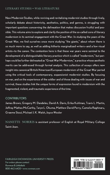 Acknowledgments Introduction: Great War Modernism Nanette Norris Section One: Non-Combatant Responses - Nostalgia, Legacies, and Recuperations Homeric Cheeses and the Breast of a Decrepit Nurse: Ruskin and Marinetti on Art, War, and Peace Michael J. K. Walsh The Irrepressible Conflict: The Southern Agrarians and World War One David A. Davis "A Reconstructionary Tale": Ford Madox Ford's Georgic Response to World War One Jeffrey Mathes McCarthy Non-Combatancy, Narrative, and Henry Green's Pack My Bag Taryn Okuma Painting Abstraction/Observing Destruction at the Front Graeme Stout Section Two: High Modernists and the Shock of War World War I and Messianic Voids in Virginia Woolf's To the Lighthouse Camelia Raghinaru H. D. and the Secrets of Redemption Nanette Norris Violence and Laughter in Women in Love Joyce Wexler You Give Them Money, They Give You a Stuffed Dog: Modernism and Survival in The Sun Also Rises Gregory M. Dandeles Section Three: Soldiers and Soldiering Anonymity, Transnational Identity, and A German Deserter's War Experience Erika Kuhlman Rosenberg's Half-Life between Romanticism and Modernism James Brown From Drills to Dreams: "Making the Mould" of Retreat in John Dos Passos'Three Soldiers Matthew David Perry A Necessary Aesthetics: Modernism's Role in Stabilizing War Narratives Through Poetry ? David Jones to Brian Turner (and Beyond) Travis L. Martin Bibliography About the Contributors Index