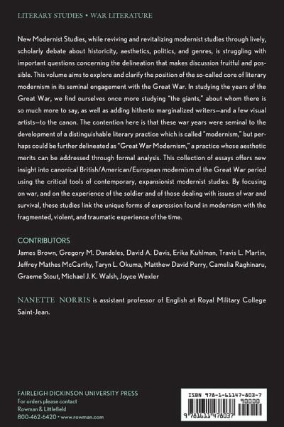 Acknowledgments Introduction: Great War Modernism Nanette Norris Section One: Non-Combatant Responses - Nostalgia, Legacies, and Recuperations Homeric Cheeses and the Breast of a Decrepit Nurse: Ruskin and Marinetti on Art, War, and Peace Michael J. K. Walsh The Irrepressible Conflict: The Southern Agrarians and World War One David A. Davis "A Reconstructionary Tale": Ford Madox Ford's Georgic Response to World War One Jeffrey Mathes McCarthy Non-Combatancy, Narrative, and Henry Green's Pack My Bag Taryn Okuma Painting Abstraction/Observing Destruction at the Front Graeme Stout Section Two: High Modernists and the Shock of War World War I and Messianic Voids in Virginia Woolf's To the Lighthouse Camelia Raghinaru H. D. and the Secrets of Redemption Nanette Norris Violence and Laughter in Women in Love Joyce Wexler You Give Them Money, They Give You a Stuffed Dog: Modernism and Survival in The Sun Also Rises Gregory M. Dandeles Section Three: Soldiers and Soldiering Anonymity, Transnational Identity, and A German Deserter's War Experience Erika Kuhlman Rosenberg's Half-Life between Romanticism and Modernism James Brown From Drills to Dreams: "Making the Mould" of Retreat in John Dos Passos'Three Soldiers Matthew David Perry A Necessary Aesthetics: Modernism's Role in Stabilizing War Narratives Through Poetry ? David Jones to Brian Turner (and Beyond) Travis L. Martin Bibliography About the Contributors Index