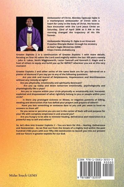 Greater Exploits 2 is a continuation of Greater Exploits 1 with more details, focusing on four (4) saints the Lord used mightily within the last 100 years namely - John G. Lakes, Smith Wigglesworth, Lester Sumrall and Kenneth E. Hagin and a host of others to equip and build you up for IMPACT wherever you are at this very moment! Greater Exploits 2 and other series of the same book are for you delivered on a platter of diamond if you say yes to any of the following questions: - Are you sick and teared of Helplessness, Hopelessness and Worthlessness without any remedy at sight? - Are you physically, emotionally and spiritually downcast? - Are you up today and down tomorrow emotionally, psychologically and physiologically like a yoyo? - Are you or anyone within your circle physically or emotionally sick, harassed, exploited and dispossessed of what rightfully belong to you or people within your circle? - Is there any prolonged sickness or illness, or negative patterns of killing, stealing and destruction that has defied your prayers and prayers of others? - Have you lost something or someone dare to you and you seem to have no answers to them all? - Do you sense or perceive you are not in the center of Gods will and purpose for your life with complete emptiness in and around you? - Are you hungry to be able to minister healing, deliverance and restoration in a powerful way to self and others? Then come along with me with seven (7) critical conditions as follows: - Be AVAILABLE (spirit, soul and body) to partner with God. - Be BOLD to lay claim to all He has died to give you. - Be COMPASSIONATE enough to sit where people are hurting. - Be DETERMINED to keep going and never, ever give up until the word of God becomes truth and life in your circumstances and situation. - Be EARNESTLY in LOVE with God and people with no restraint. - Be FIERY in ANGER with Satan for stealing from you and others. - Be in GREAT HUNGER to pursue God until you RECOVER ALL and manifest Him to yourself and others. So, let's dive into Greater Exploits 2 - You are born for this - Healing, Deliverance and Restoration - As we find out from the Greats of a mighty God within the past hundred (100) years with over fifty (50) testimonies to launch you into our present and our future in greater exploits for our God.¿
