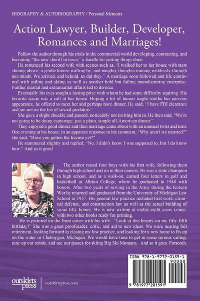 Follow the author through his trials in the commercial world developing, contracting, and becoming "the new sheriff in town," a handle for getting things done. He romanced his second wife with scenes such as, "I walked her to her house with stars shining above, a gentle breeze wafting by, and naughty thoughts running recklessly through our minds. We arrived, and behold, so did they." A marriage soon followed and life continued with sailing and skiing as well as another bold but failing manufacturing enterprise. Further marital and extramarital affairs led to divorce. Eventually his eyes sought a lasting prize with whom he had some difficulty squiring. His favorite scene was a call at her house. Hoping a bit of humor might soothe her nervous appearance, he offered to meet her and perhaps have dinner. He said, "I have FBI clearance and am not on the list of sexual predators." She gave a slight chuckle and paused, noticeably not inviting him in. He then said, "We're not going to be doing espionage, just a plain, simple all-American dinner." They enjoyed a good dinner and then marriage came about with an unusual twist and turn. One evening at his house, in an apparent response to his comment, "Why aren't we married?" she said, "Have you gotten the license yet?" He stammered slightly and replied, "No, I didn't know I was supposed to, but I do know how." And so it goes!