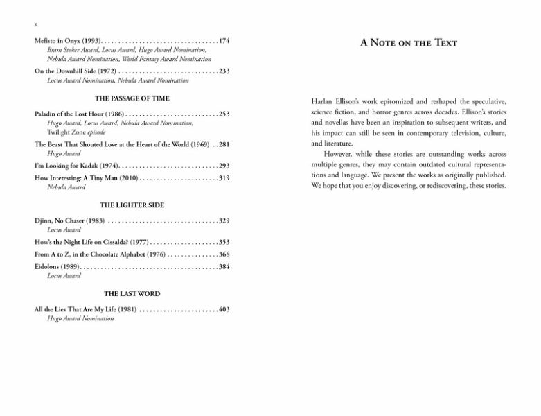 A collection of award-winning short stories by Harlan Ellison, an eight-time Hugo Award winner, five-time Bram Stoker Award winner, and four-time Nebula Award winner. As one of the great writers of speculative fiction of the twentieth century, Harlan Ellison shaped the science fiction, fantasy and horror genres.