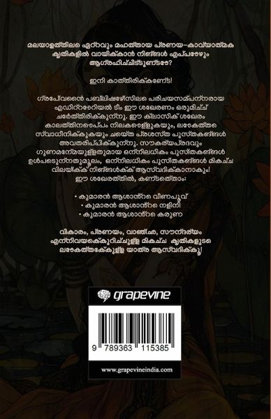 Have you always wanted to read the best in Greatest Malayalam Romantic and Poetic Works ever written?Look no further.The experienced editorial team at Grapevine Publishers has put together this curated bundle. This Classic Collection features books of acclaim which have stood the test of time and influenced the world. By putting multiple books in one convenient and quality collection, you can enjoy multiple books for one perfect price!In this collection, you will discover: ¿ ¿¿¿¿¿¿¿ (¿¿¿¿¿¿¿¿¿¿) / Veena Poovu by Kumaran Asan¿ ¿¿¿¿¿ (¿¿¿¿¿¿¿¿¿¿) / Nalini by Kumaran Asan¿ ¿¿¿¿ (¿¿¿¿¿¿¿¿¿¿) / Karuna by Kumaran Asan Enjoy a delightful journey into a world of Works on Emotion, Love, Longing & Beauty!