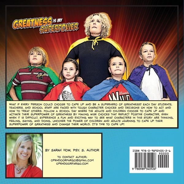 What if every person could choose to cape up and be a superhero of greatness? Each day students, teachers, and school staff are faced with tough character choices and decisions on how to act and how to treat others. Follow a school day where the adults and children choose to cape up and activate their superpower of greatness by making wise choices that reflect positive character, even when it is difficult. Experience a fun and exciting way to see what characters in this story are thinking, feeling, saying, and doing. Uncover the power of children and adults learning to cape up their superpower of greatness and change their world. It's time to cape up!