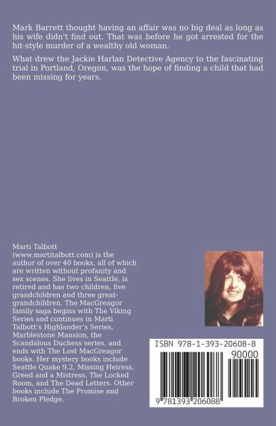 Mark Barrett thought having an affair was no big deal as long as his wife didn't find out. That was before he got arrested for the hit-style murder of a wealthy old woman. What drew the Jackie Harlan Detective Agency to the fascinating trial in Portland, Oregon, was the hope of finding a child that had been missing for years.