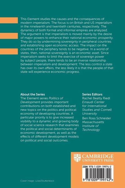 This Element studies the causes and the consequences of modern imperialism based on the argument that imperialism is moved mainly by the desire of major powers to enhance their national economic prosperity by undermining sovereignty in peripheral countries and establishing open economic access.