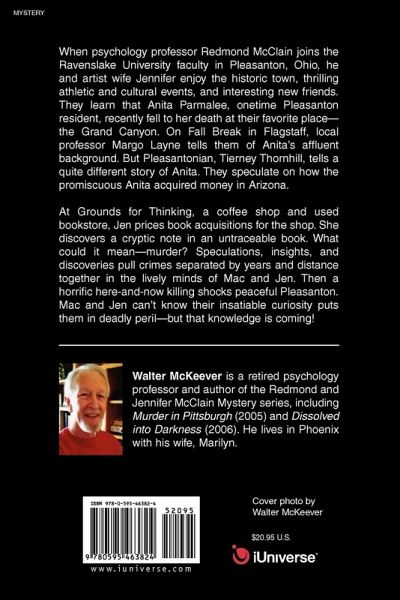 When psychology professor Redmond McClain joins the Ravenslake University faculty in Pleasanton, Ohio, he and artist wife Jennifer enjoy the historic town, thrilling athletic and cultural events, and interesting new friends. They learn that Anita Parmalee, onetime Pleasanton resident, recently fell to her death at their favorite place-the Grand Canyon. On Fall Break in Flagstaff, local professor Margo Layne tells them of Anita's affluent background. But Pleasantonian, Tierney Thornhill, tells a quite different story of Anita. They speculate on how the promiscuous Anita acquired money in Arizona. At Grounds for Thinking, a coffee shop and used bookstore, Jen prices book acquisitions for the shop. She discovers a cryptic note in an untraceable book. What could it mean-murder? Speculations, insights, and discoveries pull crimes separated by years and distance together in the lively minds of Mac and Jen. Then a horrific here-and-now killing shocks peaceful Pleasanton. Mac and Jen can't know their insatiable curiosity puts them in deadly peril-but that knowledge is coming!
