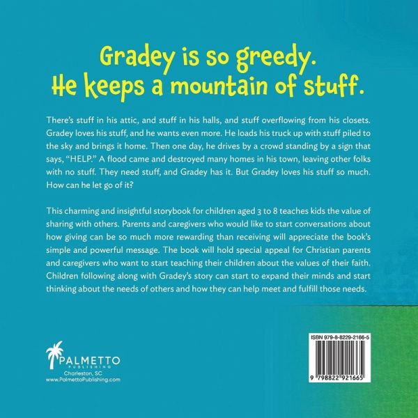Gradey is so greedy. He keeps a mountain of stuff. There's stuff in his attic, and stuff in his halls, and stuff overflowing from his closets. Gradey loves his stuff, and he wants even more. He loads his truck up with stuff to the sky and brings it home. Then one day, he drives by a people gathered in a crowd with a sign that says, "HELP." A flood came and destroyed many homes in his town, leaving other people with no stuff. They need stuff, and Gradey has it. But Gradey loves his stuff so much. How can he let go of it? This charming and insightful storybook for children aged 3 to 8 teaches kids the value of sharing with others. Parents and caregivers who would like to start conversations about how giving can be so much more rewarding than receiving will appreciate the book's simple and powerful message. The book will hold special appeal for Christian parents and caregivers who want to start teaching their children about the values of their faith as outlined in the Bible. Children following along with Gradey's story can start to expand their minds and get to thinking about the needs of others and how they can help meet and fulfill those needs.