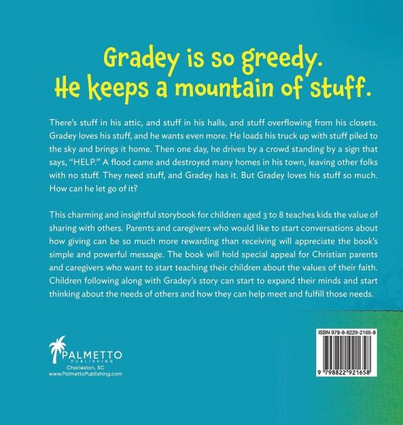 Gradey is so greedy. He keeps a mountain of stuff. There's stuff in his attic, and stuff in his halls, and stuff overflowing from his closets. Gradey loves his stuff, and he wants even more. He loads his truck up with stuff to the sky and brings it home. Then one day, he drives by a people gathered in a crowd with a sign that says, "HELP." A flood came and destroyed many homes in his town, leaving other people with no stuff. They need stuff, and Gradey has it. But Gradey loves his stuff so much. How can he let go of it? This charming and insightful storybook for children aged 3 to 8 teaches kids the value of sharing with others. Parents and caregivers who would like to start conversations about how giving can be so much more rewarding than receiving will appreciate the book's simple and powerful message. The book will hold special appeal for Christian parents and caregivers who want to start teaching their children about the values of their faith as outlined in the Bible. Children following along with Gradey's story can start to expand their minds and get to thinking about the needs of others and how they can help meet and fulfill those needs.