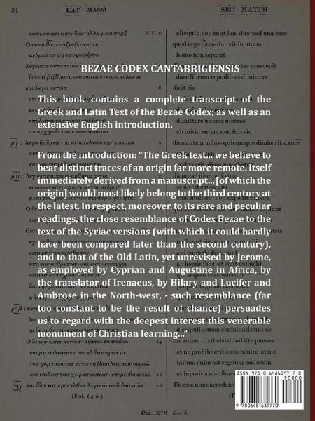 BEZAE CODEX CANTABRIGIENSIS This book contains a complete transcript of the Greek and Latin Text of the Bezae Codex, as well as an extensive introduction in English. From the introduction: "The Greek text... we believe to bear distinct traces of an origin far more remote. Itself immediately derived from a manuscript... [of which the origin] would most likely belong to the third century at the latest. In respect, moreover, to its rare and peculiar readings, the close resemblance of Codex Bezae to the text of the Syriac versions (with which it could hardly have been compared later than the second century), and to that of the Old Latin, yet unrevised by Jerome, as employed by Cyprian and Augustine in Africa, by the translator of Irenaeus, by Hilary and Lucifer and Ambrose in the North-west, - such resemblance (far too constant to be the result of chance) persuades us to regard with the deepest interest this venerable monument of Christian learning..."