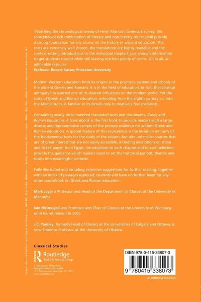 Containing nearly 300 translated texts and documents, Greek and Roman Education: A Sourcebook is the first book to provide readers with a large, diverse and representative sample of the primary evidence for ancient Greek and Roman education. A special feature of this Sourcebook is the inclusion not only of the fundamental texts for the study of the subject, but also unfamiliar sources that are of great interest but are not easily accessible, including inscriptions on stone and Greek papyri from Egypt. Introductions to each chapter and to each selection provide the guidance which readers need to set the historical periods, themes and topics into meaningful contexts. Fully illustrated and including extensive suggestions for further reading, together with an index of passages explored, students will have no further need for any other sourcebook on Greek and Roman education.