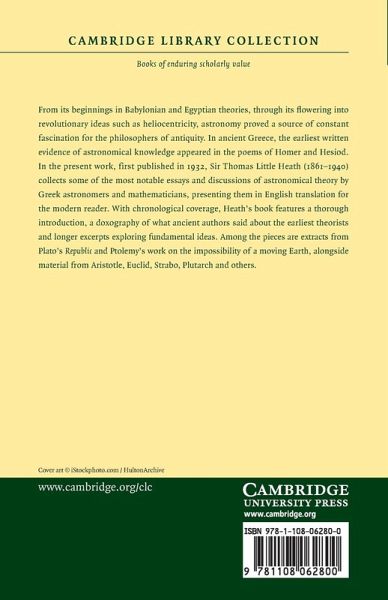 From its beginnings in Babylonian and Egyptian theories, through its flowering into revolutionary ideas such as heliocentricity, astronomy proved a source of constant fascination for the philosophers of antiquity. In ancient Greece, the earliest written evidence of astronomical knowledge appeared in the poems of Homer and Hesiod. In the present work, first published in 1932, Sir Thomas Little Heath (1861-1940) collects some of the most notable essays and discussions of astronomical theory by Greek astronomers and mathematicians, presenting them in English translation for the modern reader. With chronological coverage, Heath's book features a thorough introduction, a doxography of what ancient authors said about the earliest theorists and longer excerpts exploring fundamental ideas. Among the pieces are extracts from Plato's Republic and Ptolemy's work on the impossibility of a moving Earth, alongside material from Aristotle, Euclid, Strabo, Plutarch and others.