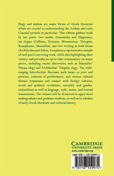 Introduction; 1. Elegy and iambus as poetic forms; 2. Performance and mobility; 3. Poets and personae; 4. Society and culture; 5. Language, style, metre; 6. Transmission of the text; Greek elegy and Iambus: A Selection: Archilochus; Semonides; Callinus; Tyrtaeus; Mimnermus; Solon; Theognis; Xenophanes; Hipponax; Simonides; Commentary.