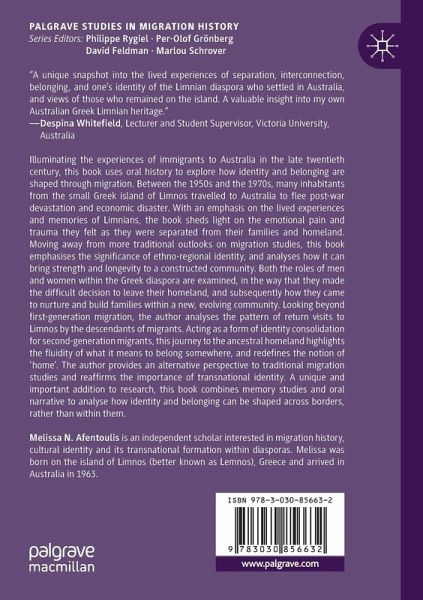 Illuminating the experiences of immigrants to Australia in the late twentieth century, this book uses oral history to explore how identity and belonging are shaped through migration. Between the 1950s and the 1970s, many inhabitants from the small Greek island of Limnos travelled to Australia to flee post-war devastation and economic disaster. With an emphasis on the lived experiences and memories of Limnians, the book sheds light on the emotional pain and trauma they felt as they were separated from their families and homeland. Moving away from more traditional outlooks on migration studies, this book emphasises the significance of ethno-regional identity, and analyses how it can bring strength and longevity to a constructed community. Both the roles of men and women within the Greek diaspora are examined, in the way that they made the difficult decision to leave their homeland, and subsequently how they came to nurture and build families within a new, evolving community. Looking beyond first-generation migration, the author analyses the pattern of return visits to Limnos by the descendants of migrants. Acting as a form of identity consolidation for second-generation migrants, this journey to the ancestral homeland highlights the fluidity of what it means to belong somewhere, and redefines the notion of 'home'. The author provides an alternative perspective to traditional migration studies and reaffirms the importance of transnational identity. A unique and important addition to research, this book combines memory studies and oral narrative to analyse how identity and belonging can be shaped across borders, rather than within them.