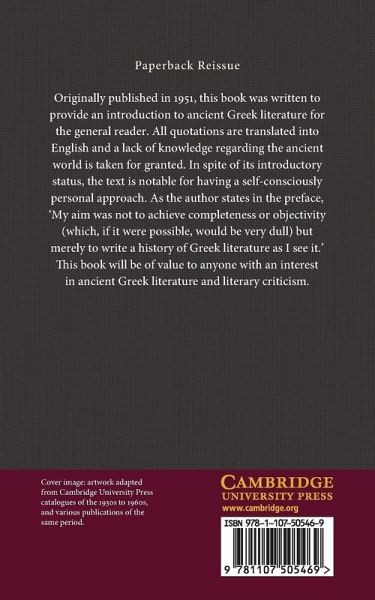 Originally published in 1951, this book was written to provide an introduction to ancient Greek literature for the general reader. All quotations are translated into English and a lack of knowledge regarding the ancient world is taken for granted. In spite of its introductory status, the text is notable for having a self-consciously personal approach. As the author states in the preface, 'My aim was not to achieve completeness or objectivity (which, if it were possible, would be very dull) but merely to write a history of Greek literature as I see it.' This book will be of value to anyone with an interest in ancient Greek literature and literary criticism.