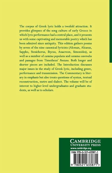 Provides a varied selection from the attractive corpus of Greek lyric, including well-known as well as some lesser studied poems. The original Greek text is accompanied by a commentary and a detailed introduction. The volume will be of interest to advanced undergraduates and graduate students as well as to scholars.