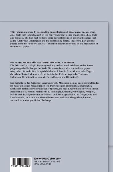 The volume collects papers presented at the International Conference "Greek Medical Papyri - Text, Context, Hypertext" held at the University of Parma on November 2-4, 2016, as the final event of the ERC project DIGMEDTEXT, aimed primarily at creating an online textual database of the Greek papyri dealing with medicine. The contributions, authored by outstanding papyrologists and historians of the ancient medicine, deal with a variety of topics focused on the papyrological evidence of ancient medical texts and contexts. The first part, devoted to "medical texts", contains some new reflections on important sources such as the Anonymus Londinensis and the Hippocratic corpus, as well as on specific themes like the pharmacological vocabulary, the official medical reports, the medical care in the Roman army. The second part collects papers about the "doctors' context", providing highlights from broader viewpoints like the analysis of the writing supports, the study of the ostraka from the Eastern Desert, the evidence of inscriptions and philosophical texts. The third part is entirely focused on the DIGMEDTEXT project itself: the team members present some relevant key issues raised by the digitisation of the medical papyri.