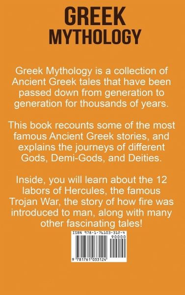 GREEK MYTHOLOGY Greek Mythology is a collection of Ancient Greek tales that have been passed down from generation to generation for thousands of years. These stories once formed a major religion, and people worshiped the Gods you will soon learn of. This book recounts some of the most famous Ancient Greek stories, and explains the journeys of different Gods, Demi-Gods, and Deities. You will learn about the 12 labors of Hercules, the famous Trojan War, and the story of how fire was introduced to man, along with many other tales. Greek Mythology has helped to shape the plot-lines of many of today's most famous books and movies. The stories presented within this book are meaningful, interesting, exciting, and most of all enjoyable to learn about. Here Is What You'll Learn About... The Different Gods li> Hercules 12 Labors The Story Of Pandora’s Box The Trojan War Prometheus Achilles & His Heel Much, much more!