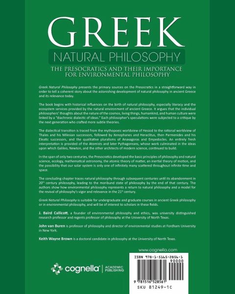 Greek Natural Philosophy presents the primary sources on the Presocratics in a straightforward way in order to tell a coherent story about the astonishing development of natural philosophy in ancient Greece and its relevance today. The book begins with historical influences on the birth of natural philosophy, especially literacy and the ecosystem services provided by the natural environment of ancient Greece. It argues that the individual philosophers’ thoughts about the nature of the cosmos, living things, humankind, and human culture were linked by a "diachronic dialectic of ideas." Each philosopher’s speculations were subjected to a critique by the next generation who crafted more subtle theories. The dialectical transition is traced from the mythopoeic worldview of Hesiod to the rational worldview of Thales and his Milesian successors, followed by Xenophanes and Heraclitus, then Parmenides and his Eleatic successors, and the qualitative pluralisms of Anaxagoras and Empedocles. An entirely fresh interpretation is provided of the Atomists and later Pythagoreans, whose work culminated in the ideas upon which Galileo, Newton, and the other architects of modern science, continued to build. In the span of only two centuries, the Presocratics developed the basic principles of philosophy and natural science, ecology, mathematical astronomy, the atomic theory of matter, an inertial theory of motion, and the possibility that our solar system is only one of infinitely many scattered throughout infinite time and space. The concluding chapter traces natural philosophy through subsequent centuries until its abandonment in 20th century philosophy, leading to the moribund state of philosophy by the end of that century. The authors show how environmental philosophy represents a return to natural philosophy and a model for the revival of philosophy’s vigor and relevance in the 21st century. Greek Natural Philosophy is suitable for undergraduate and graduate courses in ancient Greek philosophy or in environmental philosophy, and will be of interest to scholars in these fields. J. Baird Callicott, a founder of environmental philosophy and ethics, was university distinguished research professor and regents professor of philosophy at the University of North Texas. John van Buren is professor of philosophy and director of environmental studies at Fordham University in New York. Keith Wayne Brown is a doctoral candidate in philosophy at the University of North Texas.