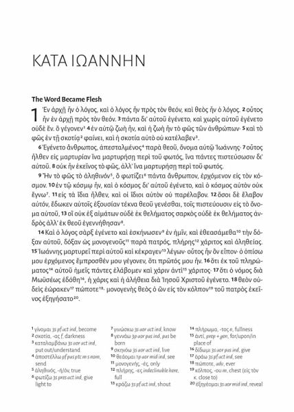 Fußnoten auf jeder Seite mit englischen Übersetzungen aller Wörter, die 30-Mal oder seltener im griechischen Neuen Testament vorkommen Alle Wortbedeutungen werden passend zum unmittelbaren Kontext gegeben und erleichtern so unmittelbar das Verständnis Übersetzung schwieriger idiomatischer Wortverbindungen Grammatikalische Analyse sämtlicher schwieriger Verbformen