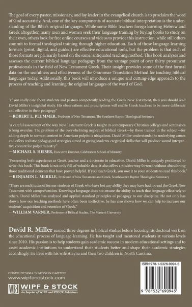 The goal of every pastor, missionary, and lay leader in the evangelical church is to proclaim the word of God accurately. And, one of the key components of accurate biblical interpretation is the understanding of the Bible's original languages. While some Bible teachers forego learning Hebrew and Greek altogether, many men and women seek their language training by buying books to study on their own, others look for free online courses and videos to provide this instruction, while still others commit to formal theological training through higher education. Each of those language-learning formats (print, digital, and guided) are effective educational tools, but the problem is that each of those formats are primarily based on the same, antiquated teaching method. This book analyzes and assesses the current biblical language pedagogy from the vantage point of over thirty prominent professionals in the field of New Testament Greek. Their insight provides some of the first formal data on the usefulness and effectiveness of the Grammar-Translation Method for teaching biblical languages today. Additionally, this book will introduce a unique and cutting-edge approach to the process of teaching and learning the original languages of the word of God.