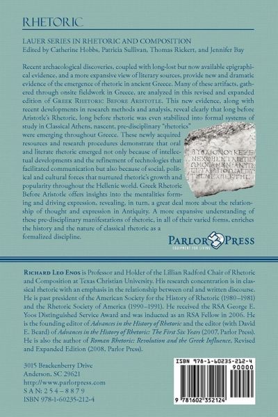 Recent archaeological discoveries, coupled with long-lost but now available epigraphical evidence, and a more expansive view of literary sources, provide new and dramatic evidence of the emergence of rhetoric in ancient Greece. Many of these artifacts, gathered through onsite fieldwork in Greece, are analyzed in this revised and expanded edition of GREEK RHETORIC BEFORE ARISTOTLE. This new evidence, along with recent developments in research methods and analysis, reveal clearly that long before Aristotle's Rhetoric, long before rhetoric was even stabilized into formal systems of study in Classical Athens, nascent, pre-disciplinary "rhetorics" were emerging throughout Greece. These newly acquired resources and research procedures demonstrate that oral and literate rhetoric emerged not only because of intellectual developments and the refinement of technologies that facilitated communication but also because of social, political and cultural forces that nurtured rhetoric's growth and popularity throughout the Hellenic world. GREEK RHETORIC BEFORE ARISTOTLE offers insights into the mentalities forming and driving expression, revealing, in turn, a great deal more about the relationship of thought and expression in Antiquity. A more expansive understanding of these pre-disciplinary manifestations of rhetoric, in all of their varied forms, enriches the history and the nature of classical rhetoric as a formalized discipline. RICHARD LEO ENOS is Professor and holder of the Lillian Radford Chair of Rhetoric and Composition at Texas Christian University. His research concentration is in classical rhetoric with an emphasis in the relationship between oral and written discourse. He is past president of the American Society for the History of Rhetoric (1980-1981) and the Rhetoric Society of America (1990-1991). He received the RSA George E. Yoos Award Distinguished Service and was inducted as an RSA Fellow in 2006. He is the founding editor of ADVANCES IN THE HISTORY OF RHETORIC and the editor (with David E. Beard) of ADVANCES IN THE HISTORY OF RHETORIC: THE FIRST SIX YEARS (2007, Parlor Press). He is also the author of ROMAN RHETORIC: REVOLUTION AND THE GREEK INFLUENCE, Revised and Expanded Edition (2008, Parlor Press). LAUER SERIES IN RHETORIC AND COMPOSITION, edited by Catherine Hobbs, Patricia Sullivan, Thomas Rickert, and Jennifer Bay.