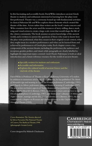 In this book, David Wiles introduces ancient Greek theater to students and enthusiasts interested in knowing how the plays were performed. Theater was a ceremony bound up with fundamental activities in ancient Athenian life and Wiles explores those elements that created the theater of the time. Actors rather than writers are the book's main concern and Wiles examines how the actor used the resources of story-telling, dance, mask, song and visual action to create a large-scale event that would shape the life of the citizen community.