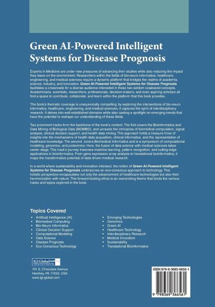 Experts in Medicine are under new pressures of advancing their studies while also reducing the impact they leave on the environment. Researchers within the fields of bio-neuro informatics, healthcare, engineering, and medical sciences require a dynamic platform that bridges the realms of academia, science, industry, and innovation. Green AI-Powered Intelligent Systems for Disease Prognosis facilitates a crossroads for a diverse audience interested in these two seldom coalesced concepts. Academicians, scientists, researchers, professionals, decision-makers, and even aspiring scholars all find a space to contribute, collaborate, and learn within the platform that this book provides. The book's thematic coverage is unequivocally compelling; by exploring the intersections of bio-neuro informatics, healthcare, engineering, and medical sciences, it captures the spirit of interdisciplinary research. It delves into well-established domains while also casting a spotlight on emerging trends that have the potential to reshape our understanding of these fields. Two prominent tracks form the backbone of the book's content. The first covers the Bioinformatics and Data Mining of Biological Data (BiDMBD), and unravels the intricacies of biomedical computation, signal analysis, clinical decision support, and health data mining. This approach holds a treasure trove of insights into the mechanisms of health data acquisition, clinical informatics, and the representation of healthcare knowledge. The second covers Biomedical Informatics and is a symposium of computational modeling, genomics, and proteomics. Here, the fusion of data science with medical sciences takes center stage.