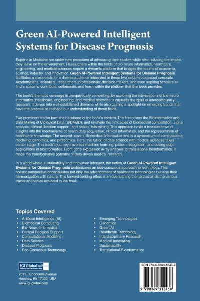 Experts in Medicine are under new pressures of advancing their studies while also reducing the impact they leave on the environment. Researchers within the fields of bio-neuro informatics, healthcare, engineering, and medical sciences require a dynamic platform that bridges the realms of academia, science, industry, and innovation. Green AI-Powered Intelligent Systems for Disease Prognosis facilitates a crossroads for a diverse audience interested in these two seldom coalesced concepts. Academicians, scientists, researchers, professionals, decision-makers, and even aspiring scholars all find a space to contribute, collaborate, and learn within the platform that this book provides. The book's thematic coverage is unequivocally compelling; by exploring the intersections of bio-neuro informatics, healthcare, engineering, and medical sciences, it captures the spirit of interdisciplinary research. It delves into well-established domains while also casting a spotlight on emerging trends that have the potential to reshape our understanding of these fields. Two prominent tracks form the backbone of the book's content. The first covers the Bioinformatics and Data Mining of Biological Data (BiDMBD), and unravels the intricacies of biomedical computation, signal analysis, clinical decision support, and health data mining. This approach holds a treasure trove of insights into the mechanisms of health data acquisition, clinical informatics, and the representation of healthcare knowledge. The second covers Biomedical Informatics and is a symposium of computational modeling, genomics, and proteomics. Here, the fusion of data science with medical sciences takes center stage.