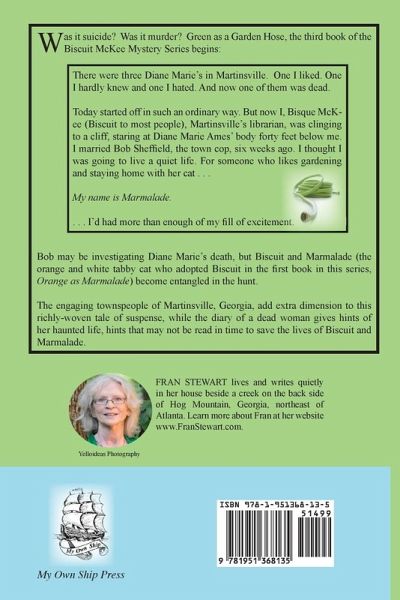 Was it suicide? Was it murder? Green as a Garden Hose, the third book of the Biscuit McKee Mystery Series begins:There were three Diane Marie's in Martinsville. One I liked. One I hardly knew and one I hated. And now one of them was dead.Today started off in such an ordinary way. But now I, Bisque McKee (Biscuit to most people), Martinsville's librarian, was clinging to a cliff, staring at Diane Marie Ames' body forty feet below me. I married Bob Sheffield, the town cop, six weeks ago. I thought I was going to live a quiet life. For someone who likes gardening and staying home with her cat . . .My name is Marmalade. . . . I'd had more than enough of my fill of excitement.Bob may be investigating Diane Marie's death, but Biscuit and Marmalade (the orange and white tabby cat who adopted Biscuit in the first book in this series, Orange as Marmalade) become entangled in the hunt.