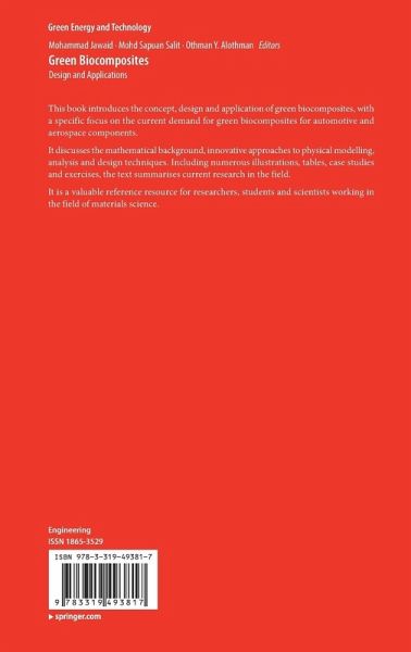 This book introduces the concept, design and application of green biocomposites, with a specific focus on the current demand for green biocomposites for automotive and aerospace components. It discusses the mathematical background, innovative approaches to physical modelling, analysis and design techniques. Including numerous illustrations, tables, case studies and exercises, the text summarises current research in the field. It is a valuable reference resource for researchers, students and scientists working in the field of materials science.